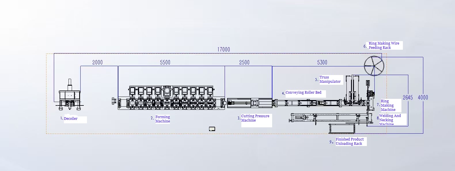 A linha de produção consiste em: desenrolador hidráulico de 3 toneladas → máquina de conformação de parafusos de ancoragem → unidade de contagem, estreitamento e corte → alimentador → braço robótico de pórtico treliçado → bancada de montagem de anéis → máquina de fabricação de anéis → máquina de soldagem de anéis → painel de controle principal → componentes hidráulicos → funil de coleta de produtos acabados.