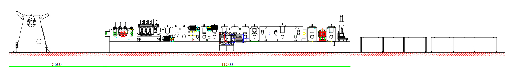 Desbobinador → Dispositivo de Alimentação e Nivelamento → Dispositivo Hidráulico de Pré-Corte e Punção → Sistema de Conformação por Rolos → Pós-Corte Hidráulico → Rack de Saída